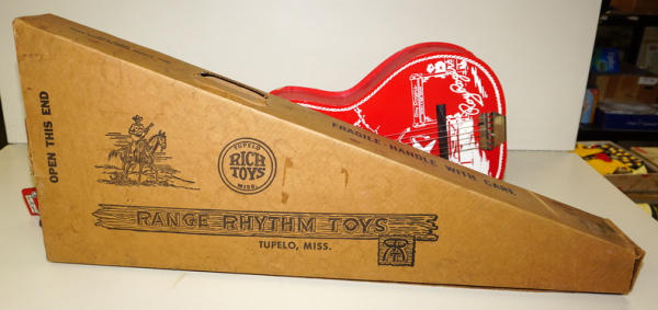 31" long, lightweight wood, made by Range Rhythm toys, even has the original hang tag and guitar pick too, box has some normal wear