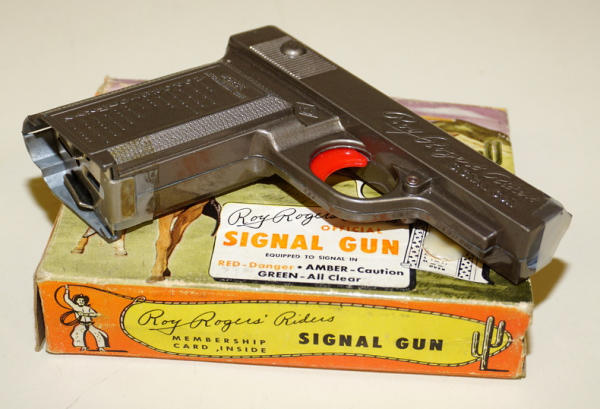 5.5" long, gun is near mint, but I think missing a piece where the clip would be, box is complete, but has general wear, great graphic box