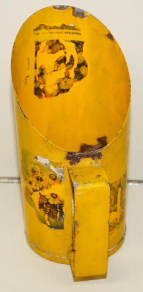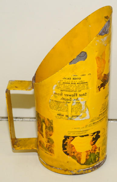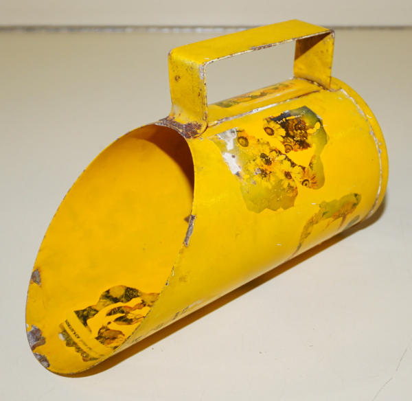 4" across, 8.5" long, has large spot of paint loss on the end with the logo and someone a long time ago glued magazine cut-outs to the body, not the best, but still a neat piece