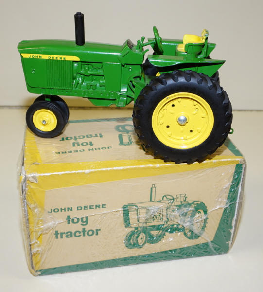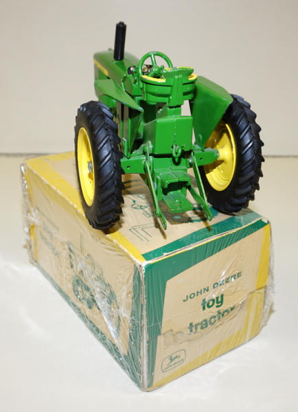 Tractor has short filters, so considered a 3020, but comes with the 3010 box. Toy has 3pt, 3 good levers, and all metal, narrow rims; toy is near mint original; box has been shrink wrapped to protect. Looks like it might be missing an outside flap, an inside flap on the other end and some general wear, box rates 7 condition