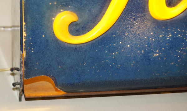 13"x24"x4" at the base, double sided embossed plastic faces with wood top and plastic sides, one side is very good, has a small piece broken off the base of the side; reverse side has some color loss to the background, so the light shines through when it's lighted, not perfect, but a really cool sign that we have never offered through our auctions