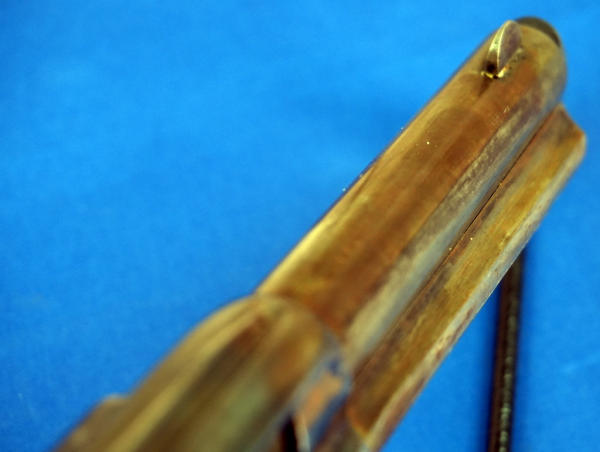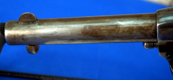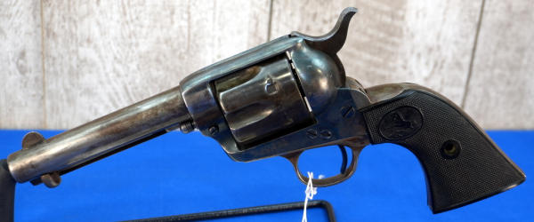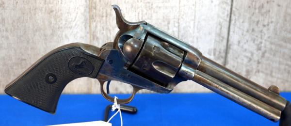 4.75" BBL; bluing is thin & looks like it was partially buffed off; original black plastic checkered grips; 6-shot fixed cylinder; USA; SN#205950; A-255