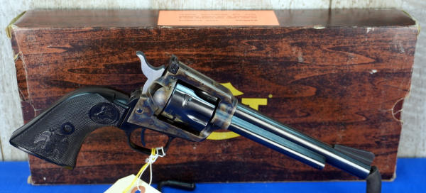 6" BBL; case hardened receiver; black plastic checkered grips; factory box; 6-shot fixed cylinder; looks mint & unfired; USA; SN#G165317; A-280