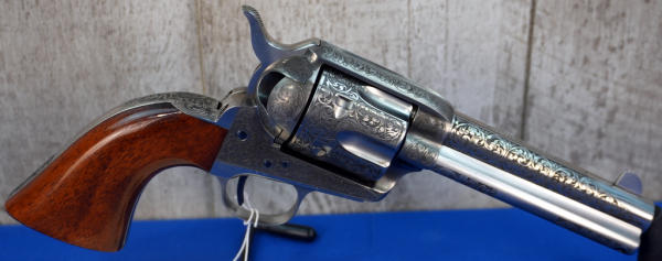 4.75" Stainless Barrel; highly factory engraved on entire gun; smooth wood grips; 6-shot fixed cylinder; has been fired but overall extremely clean like new condition; Italy; SN#J31563; A-315