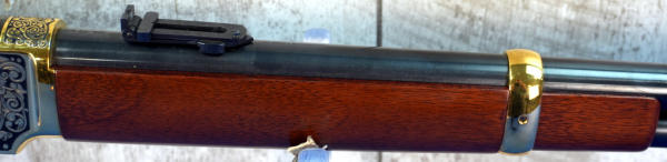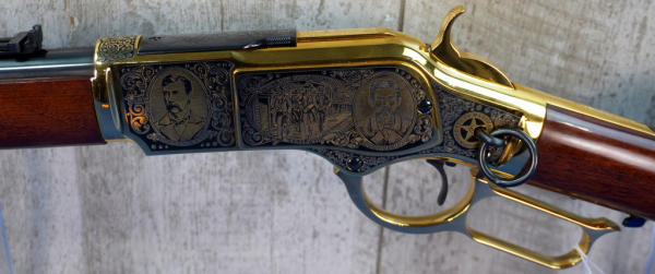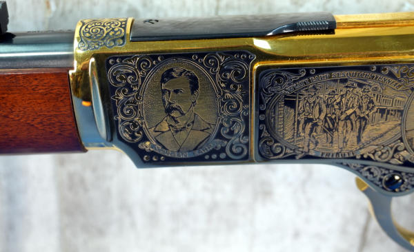 19" BBL; gold receiver w/bands, caps, sights, hammer, lever & butt plate! Highly engraved receiver w/Wyatt Earp, Virgil Earp, Morgan Earp & Doc Holliday! This is No.1 of 300!; A&A Engraving; no box but mint & beautiful firearm! Italy; SN#72806; A-255