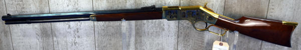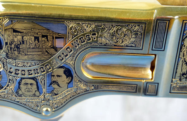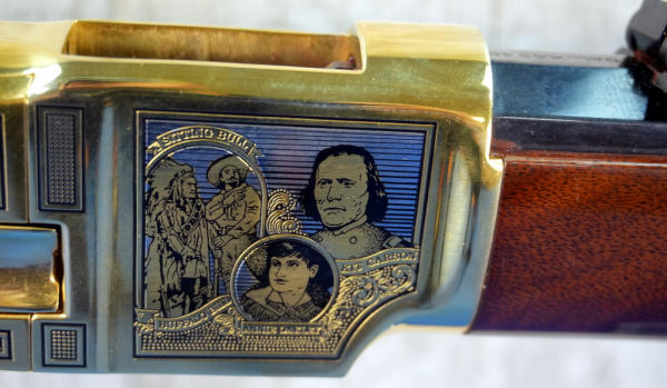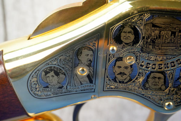 24" Oct. BBL; gold receiver, tube cap, forearm cap, hammer, lever & butt plate; highly engraved receiver w/Belle Star, Judge Parker, Geronimo, Doc Holliday, Chief Joseph, Wyatt Earp, Sitting Bull, Buffalo Bill, Annie Oakley, Kit Carson, Bat Masterson, Red Cloud, Wild Bill, Nat Love, Billy The Kid, Bob Ford, Roy Bean, Pat Garrett & Cattle Kate! No. 189 of 500; A&A Engraving; No box but mint firearm! Italy; SN#89424; A-255