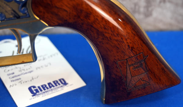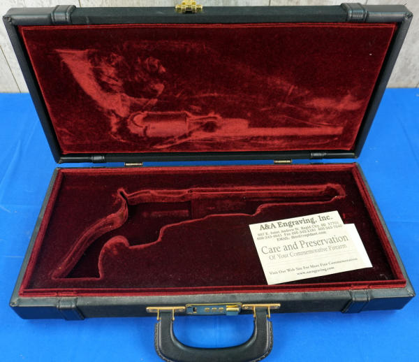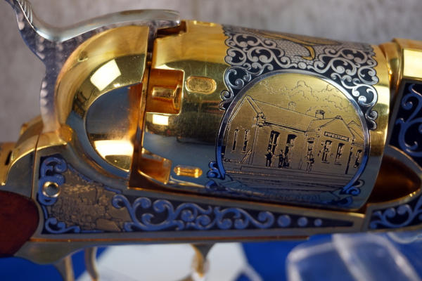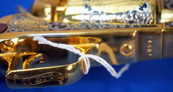 9" Barrel; all gold plated and highly engraved; jeweled hammer; smooth wood grips; No.1 of 10!; A&A Engraving; has Winnewissa Falls, Rock Island Depot, Train, Buffalo Head, Whitetail deer and more! Has a fitted padded case; wonderful piece! No Transfer needed due to blackpowder; Italy; SN#14567