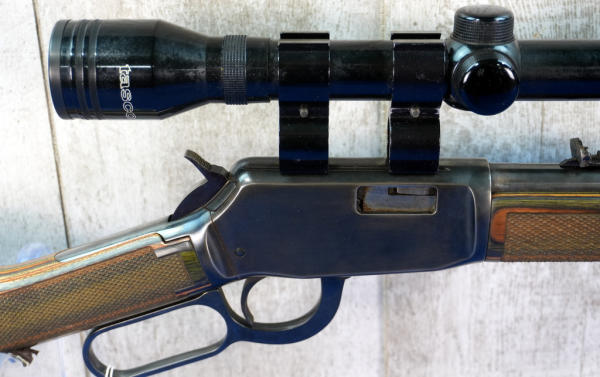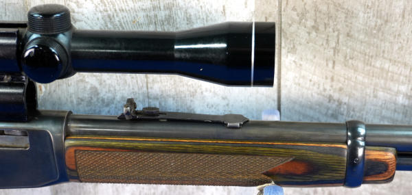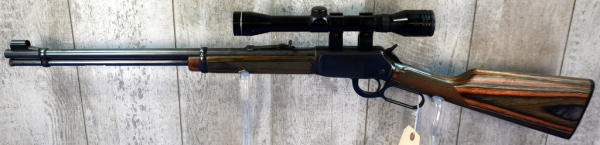 20" BBL; smooth action; green laminate wood grain stock w/nice checkering; Tasco 4x32 scope w/see-thru mounts; full length receiver tube; plastic butt plate; USA: SN#F581365; A-281