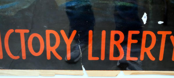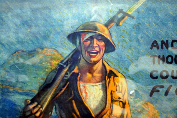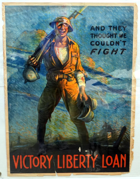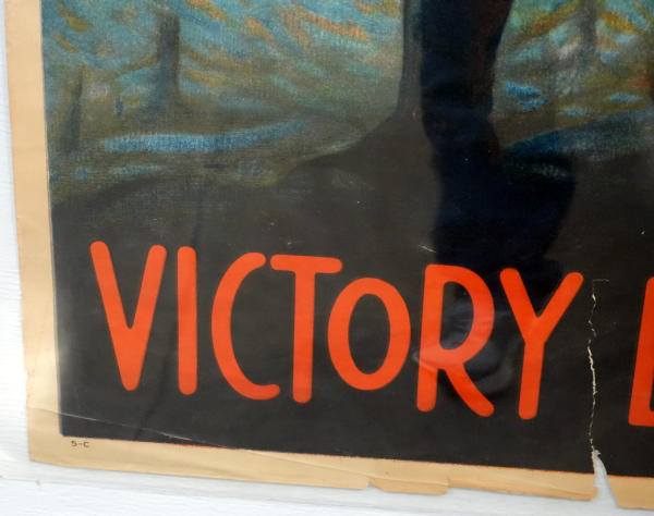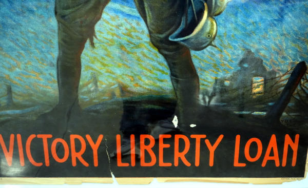 has damage around the edges and a tear on the bottom; but an amazing litho of a soldier and great color!; in plastic sleeve; 41"x30"