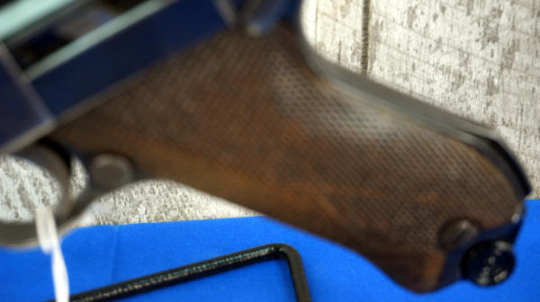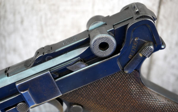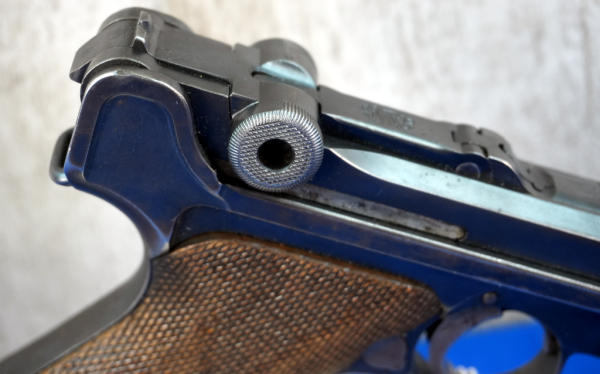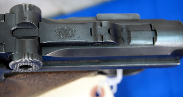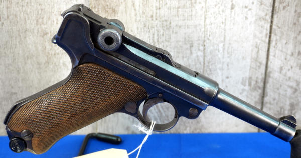 4" Tapered BBL; DWM on toggle; crown over N proof mark; #'s matching; has after market magazine w/plastic base; nice bluing; marked Germany; wood checkered grips; comes w/soft case; Germany; SN#3345; A-292