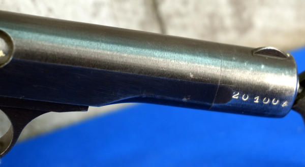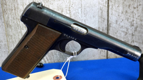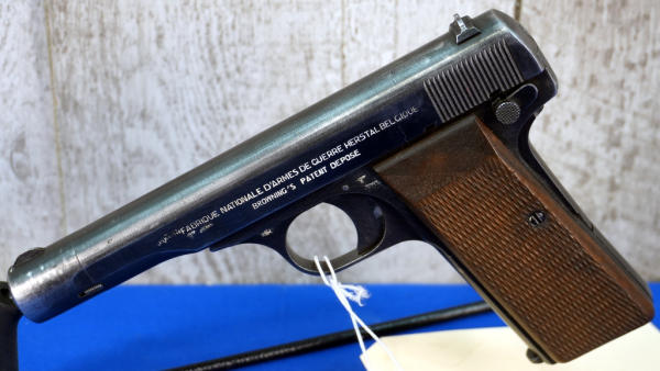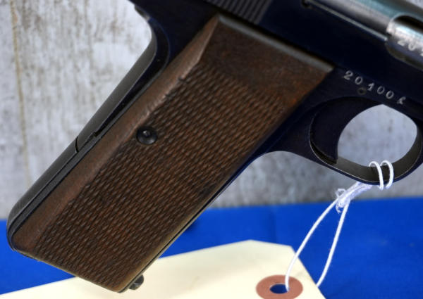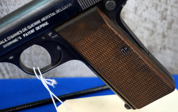 4.5" Stainless Barrel; wood checkered grips; bluing is thin around the muzzle; WaA marked; all the lettering has been filled with white, looks good; 2-magazines; period correct leather holster has some wear; Belgium; SN#20100; A-315