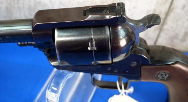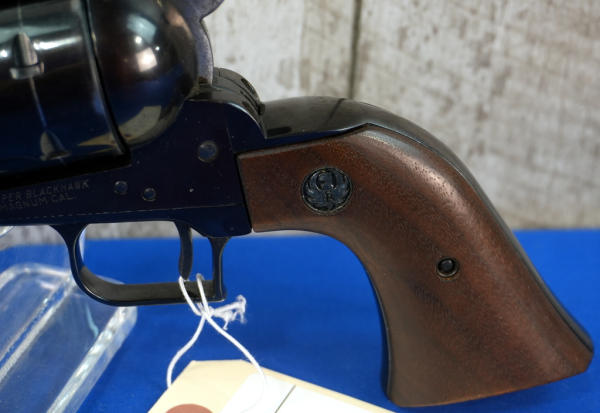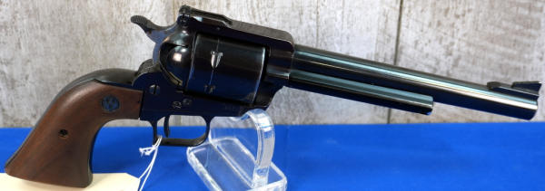 7.5" BBL; early 3-screw, no dash SN# and has flat hammer! Smooth wood grips; minor bluing loss on edges of cylinder; non-fluted 6-shot fixed cylinder; nice early Ruger revolver; USA; SN#24390; A-315