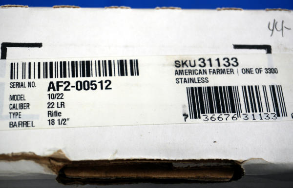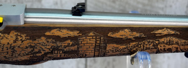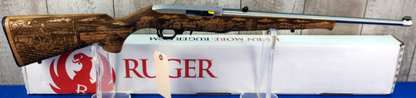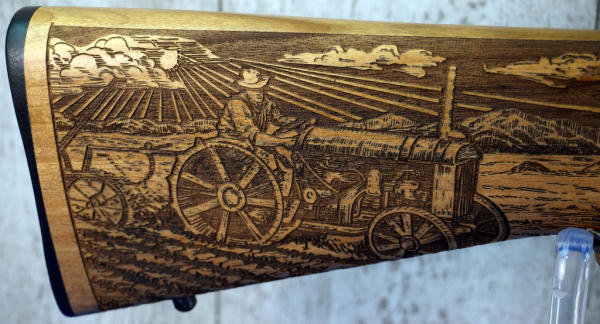 18.5" Stainless BBL; mint & unfired w/factory box; Highly engraved wood stock w/farm scenes and JD Mdl.D tractor w/driver on it!; 1 of 3300 mfg.; USA; SN#AF2-00512; A-295