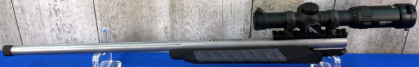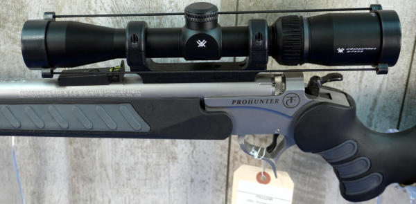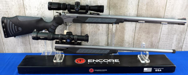 gun is mounted with a 28" fluted .50cal black powder stainless barrel w/hy-vis front sight and Vortex Crossfire II 2-7x32 scope; also includes a 26" fluted .243 win. Stainless barrel w/threaded muzzle and a Vortex Strike-Eagle 1-6x24 scope; black synthetic furniture w/rubber recoil pad; easy break action and in near mint unused condition! .243 barrel has original box; amazing set w/2-barrels and TWO Vortex Scopes! sells as a family; USA; SN#PS2229R; A-312