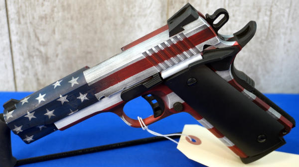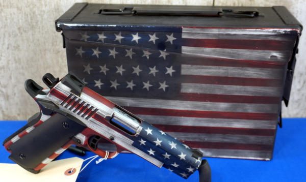 4.25" BBL; US flag Cerakote graphics; mint & unfired w/steel ammo can case; has smooth black grips and includes a set of wood checkered grips; 3-magazines; Philippines; SN#CIT065761; A-255