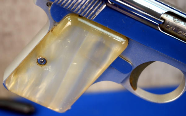 2" Stainless barrel; slide is nickeled and frame is stainless; imitation mother of pearl grips; gold trigger; mfg.1955-68; Belgium; SN#302996; A-302