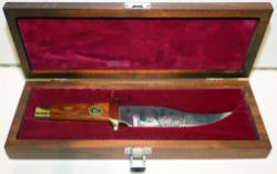 very cool handle base w/bear head; not sur if that's custom done or factory; nice stacked leather handle; blade had tape on it; 4.25" blade & 8.5" overall