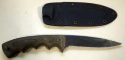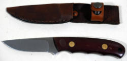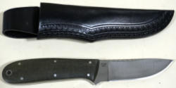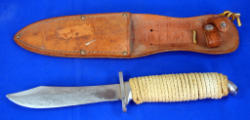 handle looks like bone insert; has some wear; leather sheath; no maker; blade is 4" and 8.25" overall