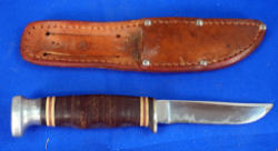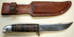 made in the USA but can't make out the maker's name dues to wear on the blade; leather sheath; blade is 5" and 10.25" overall