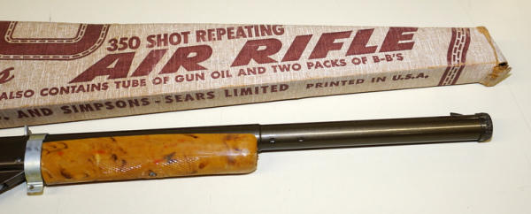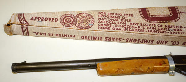 really clean and nice 1950's era BB gun, has compression and fires, box has a couple pieces missing out of the top and some general wear, but overall a good box too, neat find