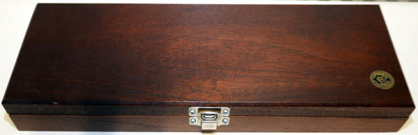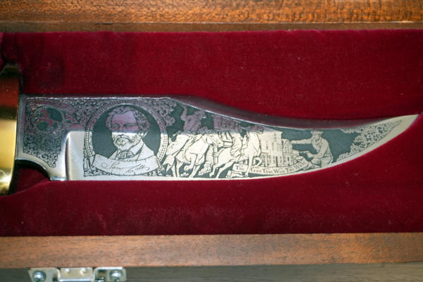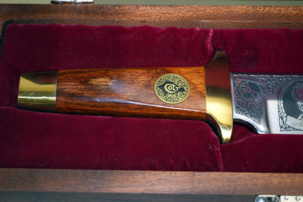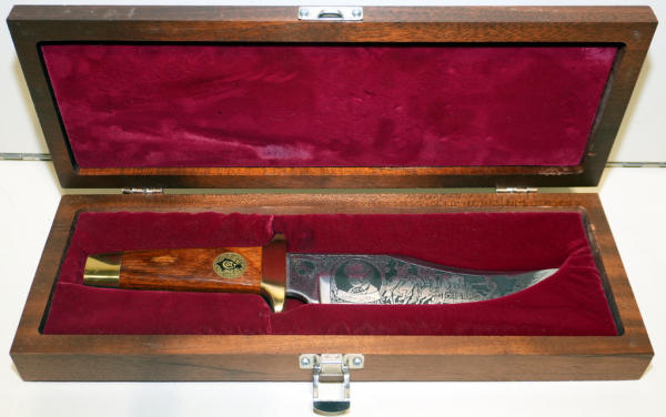 highly engraved 6.5" blade; wood handle; has wood presentation box; nice