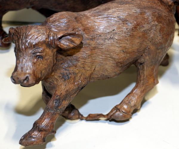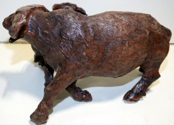 possibly African ironwood or teak; carved from a single piece of wood; great detail; approx. 15"x13"x8"; couldn't find any artist or maker mark