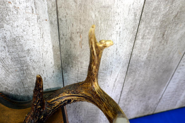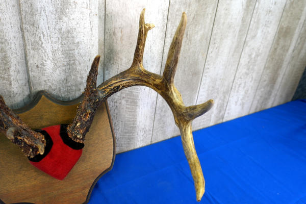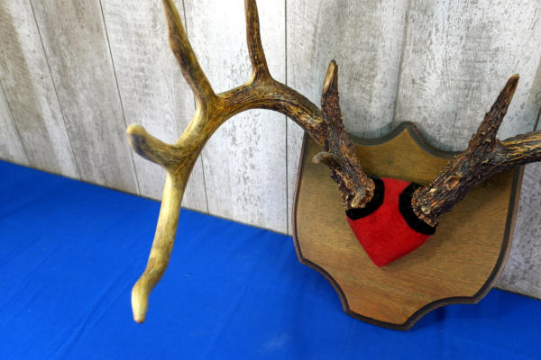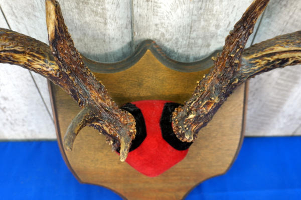 nice thick bases; mounted to wood w/felt wrap; small point on bottom of left antler to make it a 7x6; approx. 18" spread
