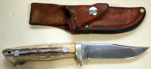 stag handle grips; nice used condition; very heavy and high quality; 4" blade & 9" overall; leather sheath