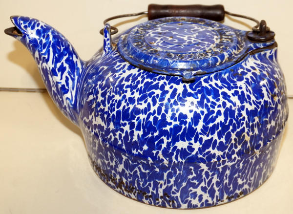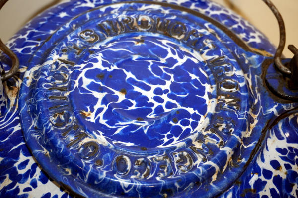very unique piece w/great blue & white porcelain coating on this cast iron kettle; has lid w/wire handle. About a gallon size