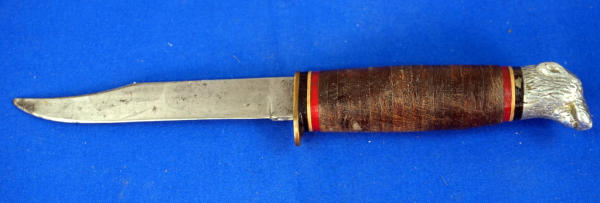 very cool handle base w/bear head; not sur if that's custom done or factory; nice stacked leather handle; blade had tape on it; 4.25" blade & 8.5" overall