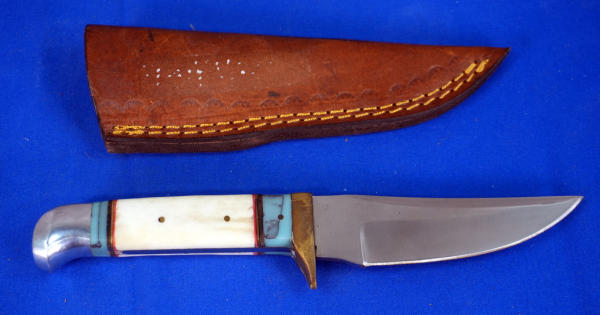 handle looks like bone insert; has some wear; leather sheath; no maker; blade is 4" and 8.25" overall
