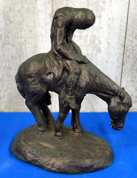made of pot metal and looks like a bronze but not as heavy as a bronze; 11" tall