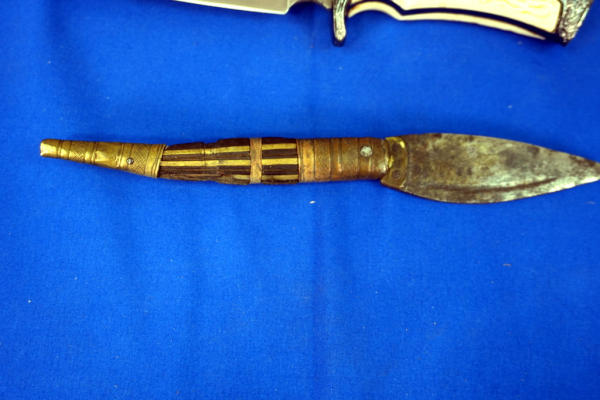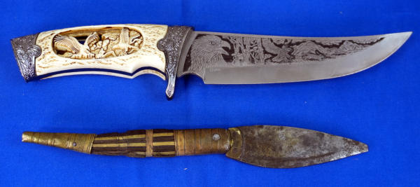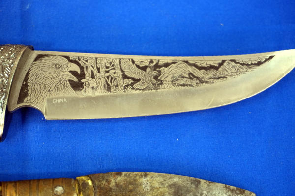 both look like novelty tourist type knives; eagle is mfg. in China and 11.25" long overall; folding knife looks like a spear head, pretty dull and worn; sell for one money