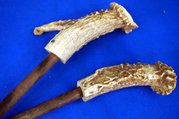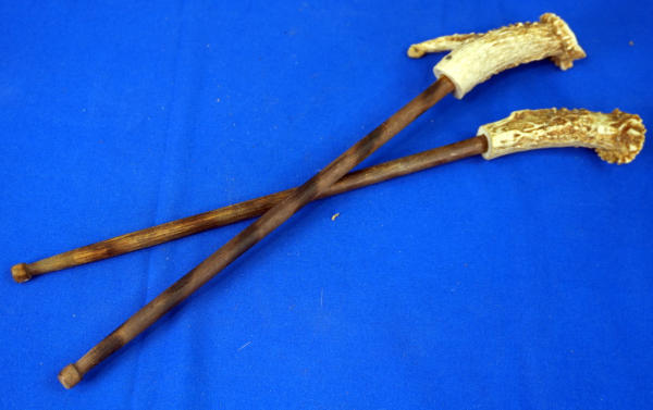 not sure but I think these are drum sticks; antler bases for the handles; about 12" long