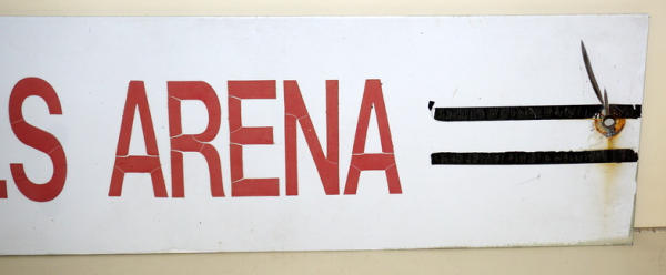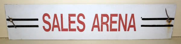 8"x36", faded vinyl letters on metal, has two large marks where a side grinder was used to grind off the bolts