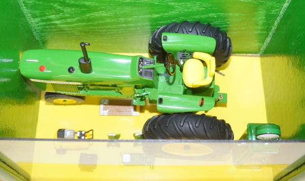 Tractor & parts are glued to the base, displays fine, no box, just the showcase