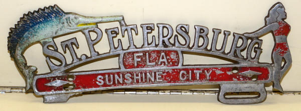 12" wide, the left mounting tab is broken off and has holes drilled on either side of "Sunshine City", original paint