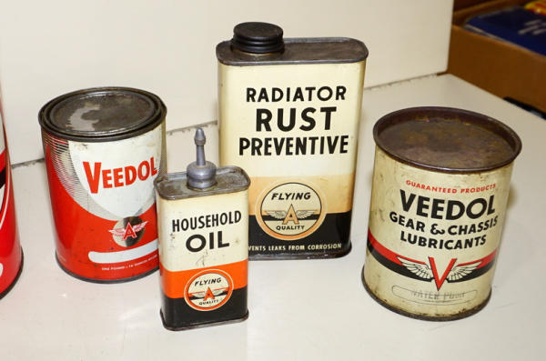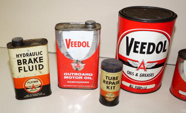 Large grease can is pretty nice, rest have some fading and wear, nice lot for the Veedol collector, all to go