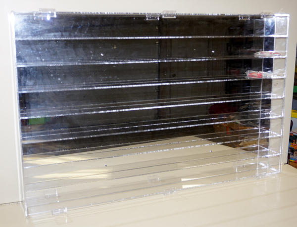 38"x24"x3", 8 sections, it will hold about 24 DCP Semi Trucks out of the box, made to hang on the wall, clean and nice, a few scuffs from handling; just soon not ship, local pickup suggested