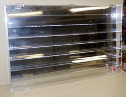 38"x24"x3", 8 sections, it will hold about 24 DCP Semi Trucks out of the box, made to hang on the wall, clean and nice, a few scuffs from handling; just soon not ship, local pickup suggested