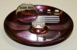 5.5" across, no logo, has some burn spots from use in the base, advertising is nice