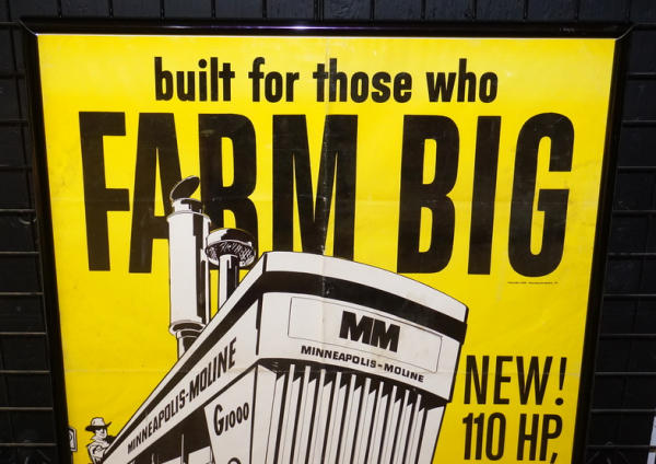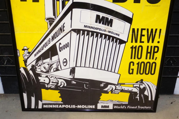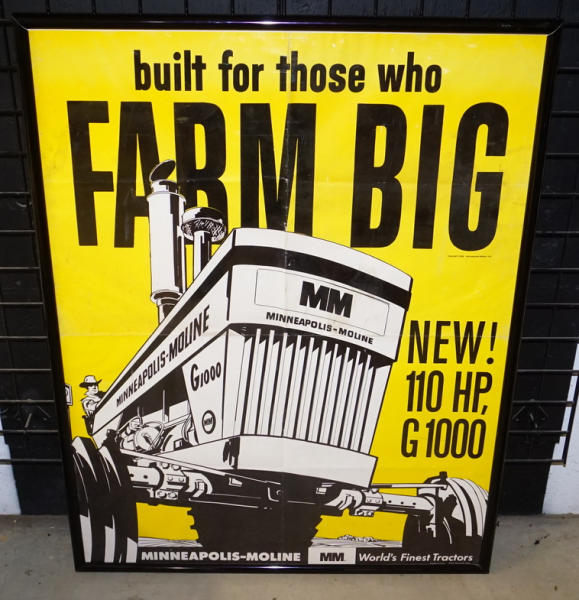 4' tall, 3' wide, in a poster frame, fantastic graphic poster, has been folded and some soiling, but overall pretty nice and impressive piece of MM Muscle Tractor advertising!