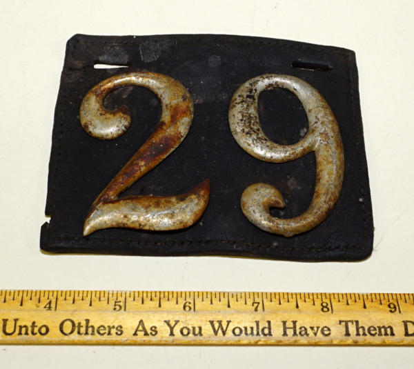 no state, 5" long, metal letters have some wear and the top left hole is torn