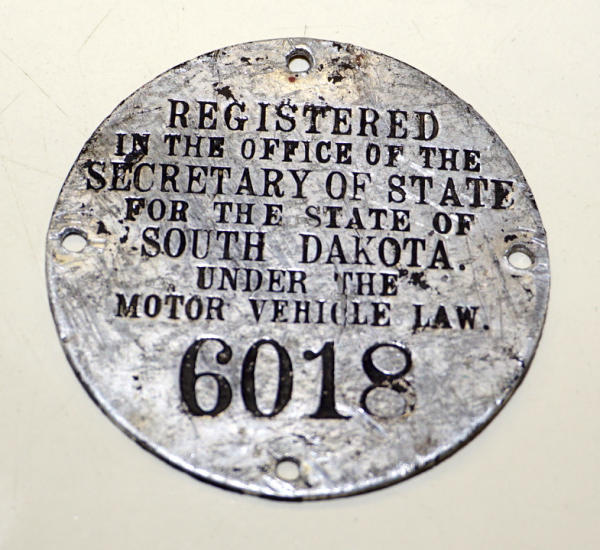 2 3/8" across, issued on 6/22/1910 to Christopher Seefelt, Clark, SD for a Ford with Horn & lights, good original with some normal wear