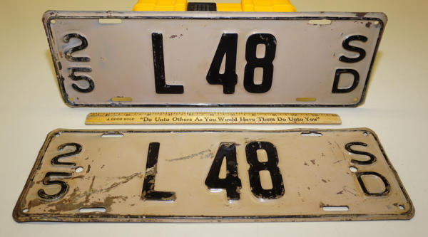one is very nice, one has some paint loss, scuffs and 2 extra mounting holes, used, but not for very long, great low number set; (This was SD's version of duplicate plates"