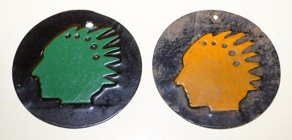 each 4" across, orange one has some paint loss and wear, green is mint, not sure what they were used for, sells as a pair