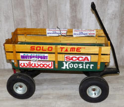 #796 - Large Tire Coaster Wagon w/ Wood Sides--covered in car-related decals