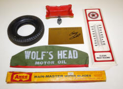#824 - Box Lot of Misc Auto Related Smalls--new Texaco Thermometer, Tire, Signed Sammy Swindell Brass plate & more