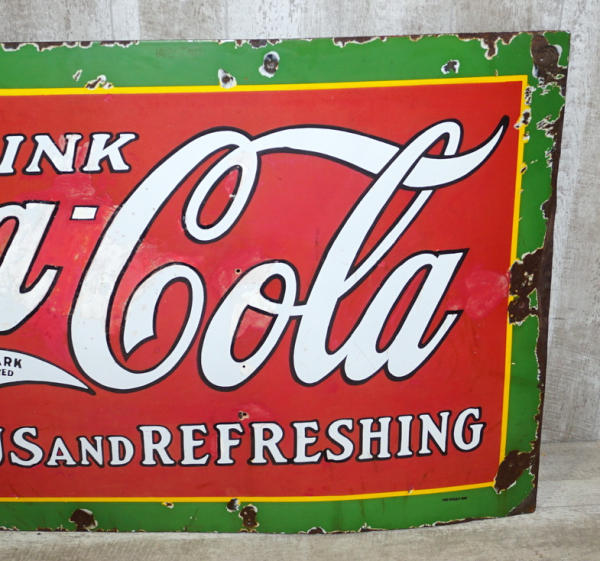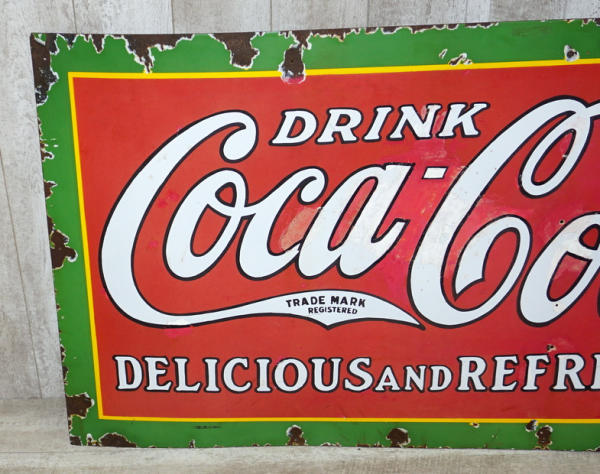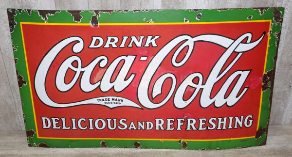 35"x59", heavy chips on the edges, several chips in the center have been touched up, some fading, a bit of a barn hanger, but an early sign