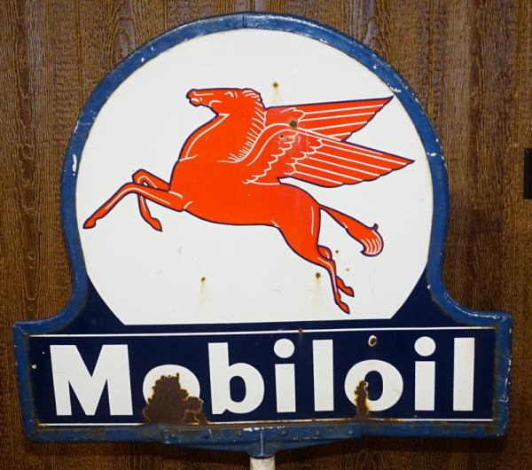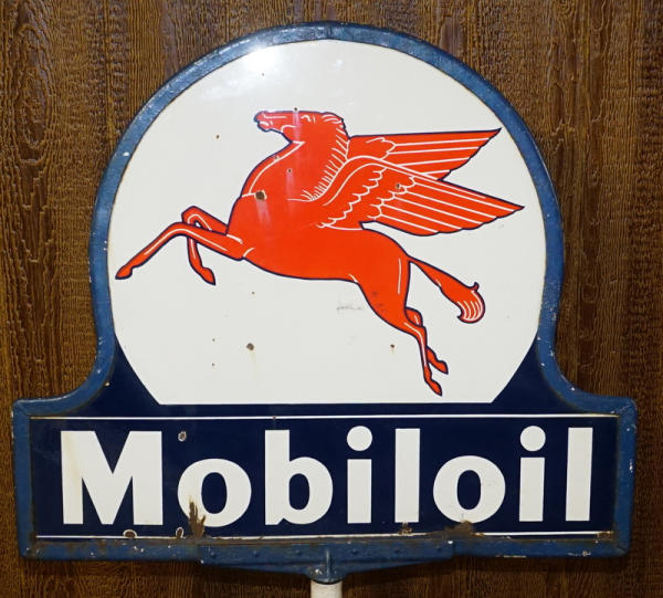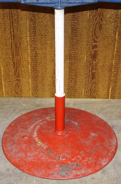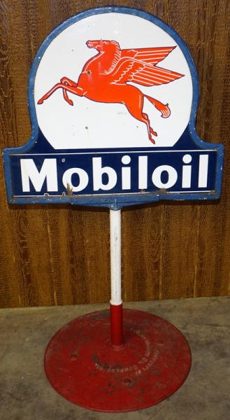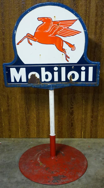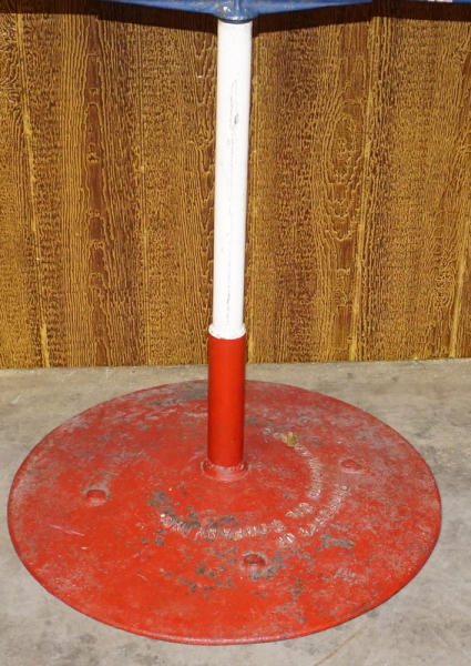 sign is 32"x36", large cast iron base is 30" across, pipe is welded to the base and sign frame; slightly bent on one side, some scattered chips and wear, but good color; no shipping, pickup only in Wakonda